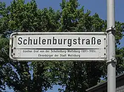 - ↑ Zum Gedächtnis an Ursula Gräfin von der Schulenburg-Wolfsburg, geb. Freiin von Dincklage. books.google.de, abgerufen am 4. Oktober 2018.