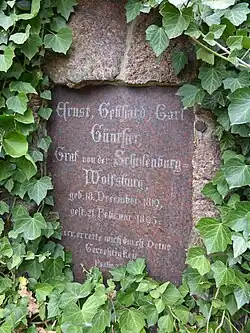 - Anna Katharina Adelheid (* 3. Mai 1867 in Wolfsburg; † 2. September 1914 in Tirlemont) wurde 1896 Diakonisse und war als Krankenschwester in Berlin tätig. Im August 1914, zu Beginn des Ersten Weltkriegs, begab sie sich zur Krankenpflege nach Belgien, wo sie bereits im Folgemonat im Lazarett Tirlemont an den Folgen von Misshandlungen durch Franc-tireurs verstarb und ein Begräbnis mit militärischen Ehren erhielt.[1] Ihr Grab befindet sich auf dem Deutschen Soldatenfriedhof Vladslo,[2] auch eine Inschrift auf dem Kriegerdenkmal in Wolfsburg erinnert an sie.