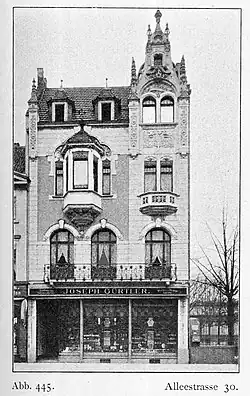 Das Gebäude war dreigeschossig. Die Fassade zur Alleestraße war im Erdgeschoss und im ersten Obergeschoss dreiachsig. Im Erdgeschoss befand sich das Ladenlokal von Joseph Gürtler; im zweiten Obergeschoss war die Fassade durch einen Balkon und einen Erkerausbau akzentuiert. Ein Ziergiebel krönte die Fassade in der rechten Achse.