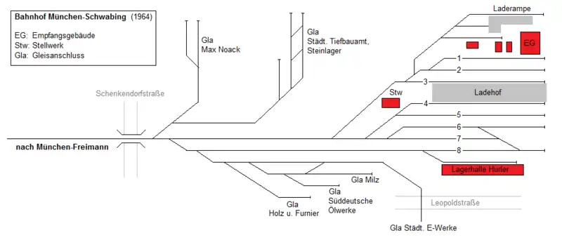 Zwischen Gleis 1 und der Laderampe befand sich das 1901 errichtete Betriebsgebäude des Bahnhofs Schwabing mit Büroräumen und einer Ladehalle.[12] In diesem war das Befehlsstellwerk des Bahnhofs untergebracht. Nördlich des Ladehofes stand das Wärterstellwerk. Zuletzt wurden alle Weichen des Bahnhofs handbetrieben vor Ort gestellt.[3][7]
