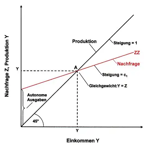 Da Produktion (=Angebot) und Einkommen immer gleich sind, wurde die Produktionsfunktion (=Angebotsfunktion) auf der 45°-Linie abgetragen. Des Weiteren wurde die Nachfragefunktion abgetragen, wobei die autonomen Ausgaben und die Steigung der Nachfragefunktion definieren.