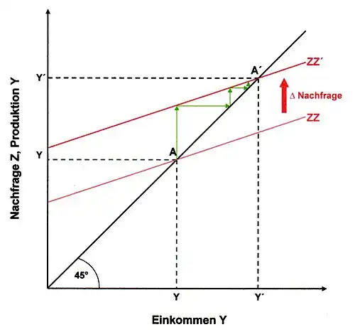Steigt die gesamtwirtschaftliche Nachfrage, verschiebt sich die ZZ-Funktion nach oben. Der Multiplikatoreffekt, welcher in der rechten Abbildung durch die Pfeile dargestellt wird, setzt ein. Die Erhöhung der Nachfrage bewirkt eine Erhöhung der Produktion, was wiederum zu einer Erhöhung des Einkommens führt. Dieses wird entsprechend der Höhe der marginalen Konsumquote ausgegeben. Es entsteht eine erneute Nachfragesteigerung, die den eben beschriebenen Prozess von Neuem anstößt. Ergebnis ist die Verschiebung der Gleichgewichtsproduktion von Punkt A zu Punkt A' sowie die Erhöhung des Einkommens um ein Vielfaches der Nachfragesteigerung. Die Höhe dieses Vielfachen bestimmt der Multiplikator.