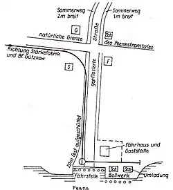 Seit 1908 bestand zwischen Gützkow-Wieck und Gützkower Fähre eine Zweigstrecke der Greifswalder Bahnen. Sie hatte an der Fähre eine Besonderheit. Da die Umgebung sumpfig war, war wenig Platz für die Bahn vorhanden. Deshalb wurde für die Loks und die Waggons eine Drehscheibe installiert, damit die Züge bis an das Bollwerk fahren konnten (siehe Skizze). 1926 musste die Strecke aber wegen Unrentabilität von der Fähre bis zur Stärkefabrik zurückgebaut werden.[6] Damit verlor die Fähre weiter an Bedeutung.