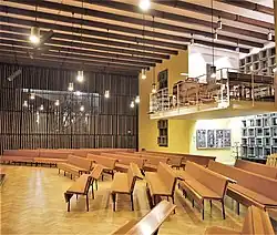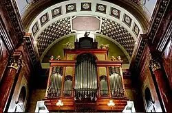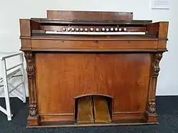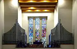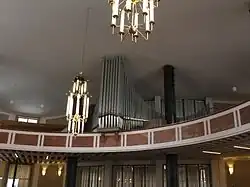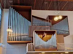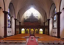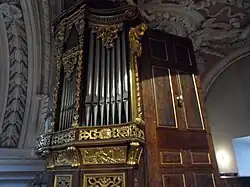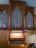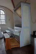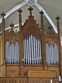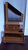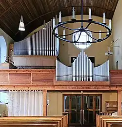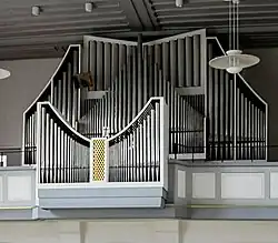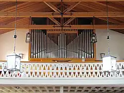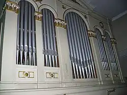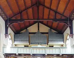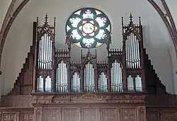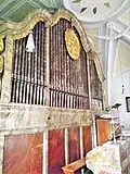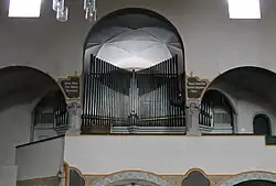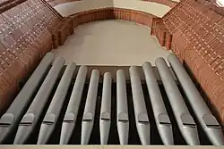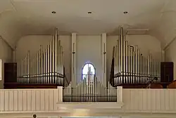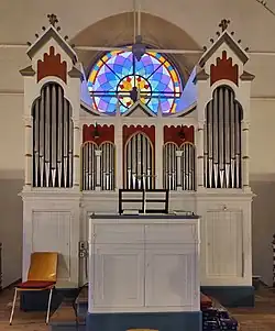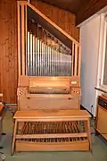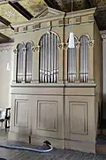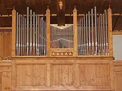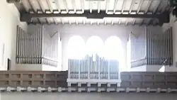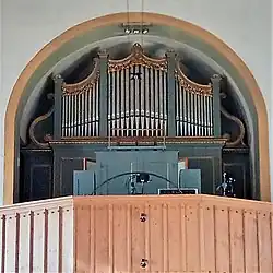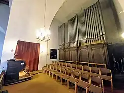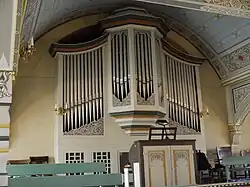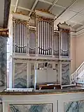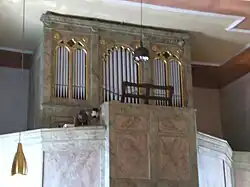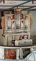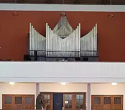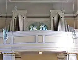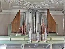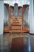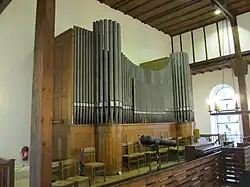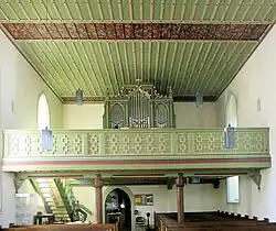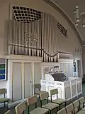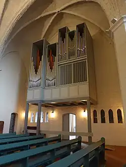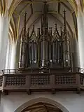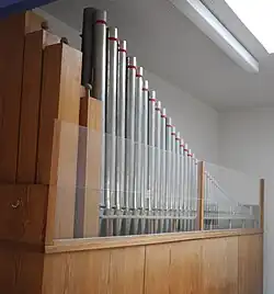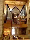 I/P | 5 | Der Prospekt an der Brüstung besteht aus Blindpfeifen. Das Werk befindet sich in einem eigenen Gehäuse hinter dem Spieltisch. → Orgel | ||||||||