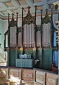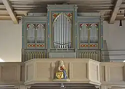 II/P | 18 | Besonderheit: 2 Harmoniumregister, 1 Physharmonika 8′ im II. Manual und ein durchschlagendes Posaunenregister 16′ im Pedal. Klanglich und technisch im Originalzustand; restauriert 2021 → Orgel | ||||||||