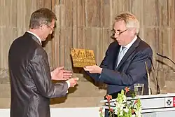 Festakt im Historischen Rathaus Köln: Oberbürgermeister Jürgen Roters überreicht Uwe Eichner, Vorstandsmitglied der GAG, eine Plakette als Geschenk.
