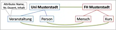 Das Bild zeigt zwei Beispiel-Ontologien aus der Universitäts-Domäne. Die Ontologie Uni Musterstadt hat ein gleichnamiges Wurzel-Konzept, welches zwei Kind-Konzepte Veranstaltung und Person besitzt. Das Konzept Veranstaltung hat die Attribute Name, Nr, Dozent und Inhalt. Eine Instanz des Konzepts Veranstaltung könnte beispielsweise die folgenden Eigenschaften aufweisen: