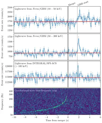 - ↑ LIGO, VIRGO, Fermi Gamma Ray Burst Monitor, INTEGRAL: Gravitational Waves and Gamma-rays from a Binary Neutron Star Merger: GW170817 and GRB 170817A arxiv:1710.05834