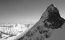 | Zillerspitze, Reichenspitze und Gabler, davor das Rainbachkees, rechts die Mannlkarscharte, unten links die Richterhütte | ||