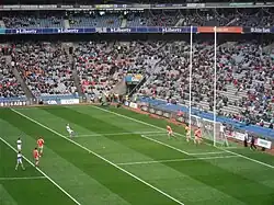 Gewöhnlich wird auf Rasen gespielt. Das Spielfeld hat eine Länge von 130 bis 145 Metern und ist 80–90 Meter breit. In der Mitte der beiden Grundlinien des Spielfeldes befinden sich die sogenannten Scoring Spaces. Sie werden von jeweils 2 Torpfosten begrenzt. Der Abstand zwischen den Torpfosten beträgt 6,50 Meter. Die Höhe der Torpfosten beträgt mindestens 7 Meter. In 2,50 Meter Höhe verläuft eine Querstange zwischen den Torpfosten. Der darunter befindliche Teil wird Tor genannt. An der Querstange und am Torpfosten sind die Tornetze befestigt. Vor den Scoring Spaces befinden sich 2 Rechtecke. Das kleinere ist 14 Meter breit und 4,50 Meter lang (Torraum). Das größere ist 19 Meter breit und 13 Meter lang (Strafraum). Außerdem gibt es eine 20-Meter-Linie sowie eine 45-Meter-Linie.