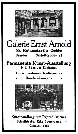 Ende September 1927 musste Gutbier aufgrund der finanziellen Verluste die Galerie Arnold an der Schloßstraße 34 schließen und sich auf das Ladengeschäft an der Sporergasse 1, Ecke Schloßstraße beschränken.