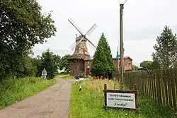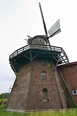 Die Galerieholländer-Windmühle auf einem dreigeschossigen, polygonalen, teils stark geschädigten Backsteinunterbau mit rundbogigen Öffnungen wurde von 1845 bis 1848 an der Stelle der Bockwindmühle gebaut. Sie beherrscht das Landschaftsbild an der Oste.