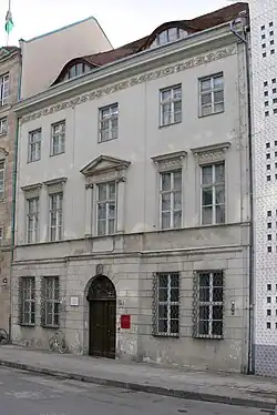 Sehenswert ist die weiße Stuckdecke in einem der Erdgeschossräume; sie wird von einem Tonnenbogen mit Stichkappen gebildet und ist reich mit Putten und Blumenranken sowie einem Plafondgemälde geschmückt. Die im Zweiten Weltkrieg stark beschädigte Fassade wurde 1963/1964 wiederhergestellt und in den Jahren 1982–1984 restauriert.