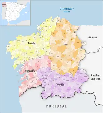 Galicien ([], galicisch Galicia [] oder Galiza [], spanisch Galicia [], portugiesisch Galiza []; offiziell galicisch Comunidade Autónoma de Galicia, spanisch Comunidad Autónoma de Galicia) ist eine Autonome Gemeinschaft im Nordwesten Spaniens. Sie gliedert sich in die vier Provinzen A Coruña, Lugo, Ourense und Pontevedra.