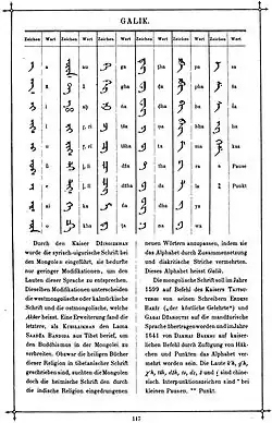 | Abstammung | Syrisches Alphabet → Sogdisches Alphabet → Uigurisches Alphabet → Mongolische Schrift → Galik-Schrift | |
