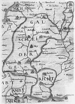 - ↑ Wilhelm Fabricius: Erläuterungen zum geschichtlichen Atlas der Rheinprovinz, 2. Band: Die Karte von 1789. Bonn, Hermann Behrend, 1898, S. 133, 154