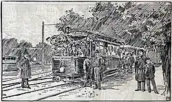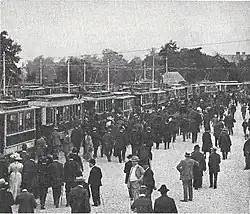 Zur Bewältigung der großen Zuschauermassen an Renntagen bestand vom 8. September 1909[7] bis 3. Juni 1951 eine 3,5 km[8] lange zweigleisige Straßenbahnlinie 81 (zunächst 80), die vom Schottentor zum Galopprennplatz fuhr.[9][Anm. 1] Eine Abstellanlage mit acht parallelen Rangiergleisen (insgesamt zehn Gleise) nahm wartende Züge auf; die Straßenbahnen wurden von einem Kontrollturm aus koordiniert.[Anm. 2] Nach Auflassung der Trasse Kanalwächterhausweg/Gärtnerstraße–Rennbahn im Jahr 1951 mussten Rennplatzbesucher bis 17. August 1969 die seit 2. September 1909 von der Rotundenbrücke zum Lusthaus verkehrende Straßenbahnlinie 80 bis Kanalwächterhausweg/Gärtnerstraße nutzen und von dort die Rennbahn zu Fuß erreichen. Nach 1969 war die Rennbahn Freudenau nur mehr mit Autobussen erreichbar.