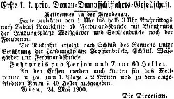 Freudenau!. In: Neues Wiener Tagblatt. Demokratisches Organ, Nr. 249/1909 (XLIII. Jahrgang), 9. September 1909, S. 10, Mitte links. (online bei ANNO). - ↑ Städtische Angelegenheiten. Die Elektrische zur Freudenau. Vollendung der neuen Praterbahn. In: Illustrierte Kronen-Zeitung, Nr. 3447/1909 (X. Jahrgang), 4. August 1909, S. 10, Mitte unten. (online bei ANNO).