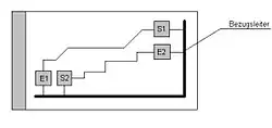 Die Bauteile auf einer Platine sind wie im nebenstehenden Bild gezeigt angeordnet. Sender und Empfänger sind über Signalleitungen miteinander verbunden. Außerdem nutzen alle Bauteile den gleichen Bezugsleiter. Die Induktivität des Bezugsleiters beträgt 260 nH. S1 schaltet einen Strom von 20 mA in 10 ns. Der daraus resultierende Spannungsabfall am Bezugsleiter berechnet sich näherungsweise zu: