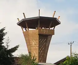 - An der Grenze zu Ehrenhausen, beim 2017 errichteten Wasserhochbehälter Weinleiten, steht seit Juni 2019 der 27 m hohe[12] Wasserturm Weinleiten, kein Wasserturm im funktionellen Sinn, sondern ein Aussichtsturm. 8 bogenförmige Holzsteher spannen den Querschnitt des taillierten Turms oben weiter auf als unten. Eine Spindel-Wendeltreppe aus Stahl führt in der Mittelachse zur Plattform in 21 m Höhe mit Aussicht ins südsteirische Weinland und einen Balkon mit Glasfenster im Boden für den Blick nach unten. Errichter ist der Wasserverband Leibnitzerfeld-Süd, der via 48"-Touchscreen am Hochbehältergebäude daneben und eine Website über die Wasserversorgung und den Weg des Wassers informiert.[13][14]