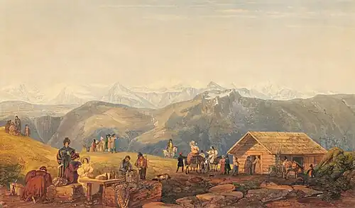 Das Bild links wurde von Johanns Kammermaler Thomas Ender kunstvoll zu Papier gebracht. Es zeigt die erzherzogliche Familie bei einem Picknick samt Gefolge auf dem Gamskarkogel.
