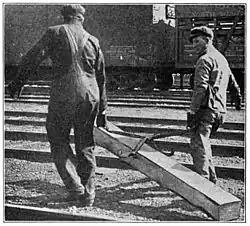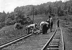 Die Streckenarbeiter mussten in regelmäßigen Abständen auch die Schienen aufhebeln, um die abgesenkten Stellen auszugleichen. Seite an Seite hoben sie mit einer vierkantigen Hacke die Schienen an und schoben Schotter unter die Bahnschwellen. Sogar bei Mannschaften, die aus acht, zehn oder mehr Arbeitern bestanden, war erst nach vielen Wiederholungen dieses Vorgangs beim Verschieben der Schienen ein Fortschritt erkennbar.[10]