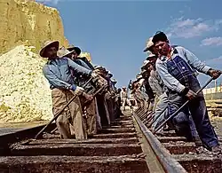 Ein Rhythmus war sowohl für das Synchronisieren der Arbeitsabläufe als auch für die Stimmung unter den Arbeitern wichtig. Sogenannte Worksongs (Arbeitslieder) und Rufe, die dem Call and Response-Prinzip (Ruf und Antwort) folgten, dienten als Mittel, die unterschiedlichen Aufgaben der Gleisarbeiten zu koordinieren. Dabei dirigierten langsamere Sprechgesänge, sogenannte Dogging-Rufe, das Aufheben und die Handhabung der Stahlschienen sowie das Abladen, Schleppen und Stapeln der Schwellen und rhythmischere Lieder leiteten das Ausrichten und Festnageln der Schienen sowie das Stopfen der Schotterbettung an.[21]