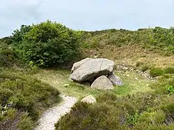 Das kleine, ovale Ganggrab, das nur deshalb kein Polygonaldolmen ist, weil es zwei statt eines Decksteins besitzt, befindet sich am Rande des Dünengürtels, etwa 40 m westlich des Westerwegs. Erhalten sind alle sieben Tragsteine und zwei Decksteine der Kammer (einer ist durchgebrochen), sowie ein kurzer Gang. Der Gang in südwestliche Richtung bestand aus zwei Trägerpaaren, hier fehlt ein Tragstein und die Decksteine. Reste eines Hügels sind nicht erhalten.