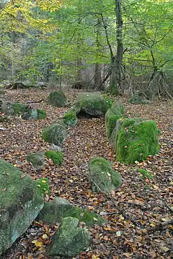 Das Ganggrab liegt beim Hof Wennebostel im Staatsforst Harsefeld südwestlich von Ostereistedt. Die Steinkammer, um die einige Steine liegen, die wahrscheinlich die Reste der Einfassung sind, hat schwer gelitten.