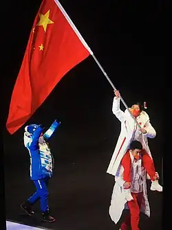 Gao Tingyu und Xu Mengtao als chinesische Fahnenträger bei der Schlussfeier der Olympischen Winterspiele 2022