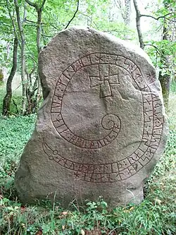 - ↑ Inschrift: + kuþlefR + seti : stff : auk : sena : þasi : uftiR slakua : sun : sia : etaþr : austr * i * karusm, Umschrift: GuðlæifR satti staf ok stæina þasi æftiR Slagva, sun sinn, ændaðr austr i Garðum(?)/Chorezm(?). Gehört wahrscheinlich zu den Ingvar-Runensteinen (1037–1041) am Kaspischen Meer