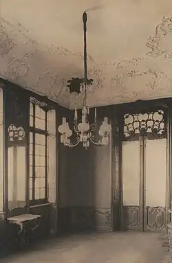 Der Pavillon selbst besaß neben dem eigentlichen Gartensaal ein Kellergeschoss und einen Dachboden; eine Treppenanlage aus Marmor führt zum zurückgesetzten, höhergelegenem Eingang in den Gartensaal. Der Pavillon hat leicht trapezförmige Ausmaße, mit einer Breite von 5,51 m bzw. 5,72 m und einer Länge von 10,52 m.[4] Neben der vorderen Eingangstür befinden sich zwei kleinere Türen, hinter denen sich ein Abstellraum und der Zugang über eine Wendeltreppe zum Dachgeschoss verbirgt.