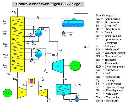 Weitere Herstellerbezeichnungen sind zum Beispiel Steam and Gas (STAG) von General Electric oder Kombianlage (KA) von Alstom. Im englischen Sprachraum spricht man von Combined Cycle Power Plant (CCPP) oder Combined Cycle Gas Turbine (CCGT).