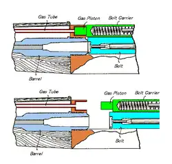 Die Übertragung der Kraft der Gase auf den Verschlussträger kann auf unterschiedliche Arten erfolgen. So gibt es Systeme mit einem Kolben oder Gasrohr und Kombinationen.