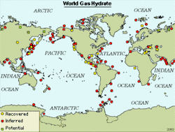 Seismische Untersuchungen in neuerer Zeit lassen vermuten, dass die Menge der Methanhydrat-Lagerstätten auf dem Meeresgrund sehr bedeutsam ist. Sie könnten daher eine mögliche wichtige Energiequelle sein, auch wenn der verlustfreie Abbau sich als recht schwierig erweisen könnte, da Methan als Treibhausgas nicht in größeren Mengen in die Atmosphäre gelangen darf. Die gesamte Menge der Treibhausgase aus fossilen Brennstoffen soll geringer sein als die Menge der Treibhausgase, die aus den Gashydratvorkommen freiwerden könnte. Sowohl Kohlenstoffdioxid als auch Methan sind Treibhausgase. Schätzungen gehen von einer Gesamtmenge von mehr als 1.000 Giga­tonnen Kohlenstoff aus, der in den verschiedenen Arten von Gashydraten gespeichert ist.[3]