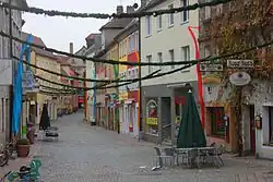 • Von-Römer-Straße, bis 1889 Judengasse:[7] Die dicht gereihte Häuserzeile im Westen der Straße steht mit den westlichen Außenwänden der Gebäude auf der Stadtmauer auf. Nahe ihrem nördlichen Ende befand sich mit dem Unteren Tor eines der beiden Stadttore. Hinter den Häusern Von-Römer-Straße 2 und 4 ist ein ehemaliger Wehrturm, der sogenannte Schwertlesturm, noch vorhanden. Um 1700 hatte der Stadtbrunnenmeister im Haus Von-Römer-Straße 9 seine Wohnung. Sie ist von einer überwiegend traufständigen Bebauung des 18. Jahrhunderts bestimmt, nachdem die Stadtmauer geschleift worden war und überbaut werden durfte. In das Haus Von-Römer-Straße 28 eingebaut ist der Rest eines spitzwinkeligen Ravelins aus der Mitte des 17. Jahrhunderts erhalten.[1]
