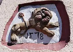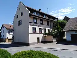 „Das unter Denkmalschutz stehende stattliche Wirtsgebäude mit der handwerklich gediegen gearbeiteten gotischen Fensterfront und den aufragenden Treppengiebeln, das aus dem 16. Jahrhundert stammt, worauf […] ein Wappenschild mit ruhendem Löwen und der Jahreszahl 1578 hinweisen, erfuhr [1742] durch J. B. Württenberger bauliche Verbesserungen.“