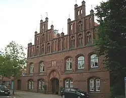 Das Vordergebäude von 1879 mit seinen zwei Geschossen, der mittigen Durchfahrt und den beiden mit Fialen besetzten Stufengiebeln wurde in Anlehnung an die beiden Giebel der Vorgängerbauten, aber im Stil der märkischen Backsteingotik errichtet. Es setzt sich dahinter rechts mit einem langen, zweigeschossigen Gebäudeteil zwischen dem Friedhof und einem Ziergarten fort. Hier befindet sich auch der Predigtsaal, dessen älteste Teile noch zum Ursprungsbau vom 1563–65 gehören.
