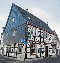 Das Eckhaus steht traufständig zur Hauptstraße (Hausnummer 110) und giebelständig zur Rheinstraße am westlichen Endpunkt der Heisterbacher Straße an einem kreuzungsähnlichen Platz, dem einstigen Marktplatz[2]. Nördlich gegenüber liegt die Niederdollendorfer Pfarrkirche.