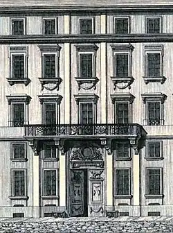 Über dem Untergeschoss mit Mezzanin, erhoben sich zwei Vollgeschosse und ein Dachgeschoss. Zwischen dem zweiten Obergeschoss und dem Dachgeschoss zog sich ein „kräftiges Hauptgesims mit Zahnschnitt“.[4] Sowohl die beiden Vollgeschosse als auch das Dachgeschoss wurden durch eine starke vertikale Betonung miteinander verbunden: „Flache Putzlisenen“[4] flankierten die Mittelachse über dem Balkon, die die zwei Vollgeschosse und das Dachgeschoss durchlief.