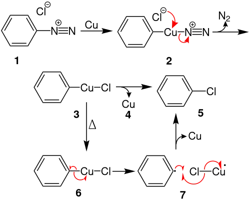 Bei der Reaktion von Diazonium-Salz 1 mit Kupfer, insertiert das Kupferatom zwischen den Phenylrest und die Diazogruppe. Aus der Zwischenstufe 2 bildet sich mit Chlorid unter Stickstoffabspaltung das Intermediat 3. Aus 3 wird das Kupfer 4 reduktiv eliminiert unter Bildung von Chlorbenzol 5.