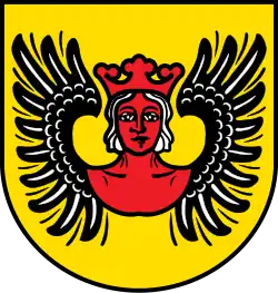 | Blasonierung: „In Gold (Gelb) ein rot gekrönter Königskopf mit langem silbernen (weißen) Haar, an den Schultern angesetzt zwei schwarze Adlerflügel.“[24] | |