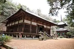 Oben angekommen sieht man die Haupthalle (金堂, Kondō; 3). Man nahm an, dass sie 1610 errichtet worden ist, aber bei einer Zerlegung des Gebäudes 1981 ergab sich ein Baujahr 1645. Die Halle ist 5 × 5 Ken groß, ist jedoch etwas breiter als tief. Der vordere Bereich (外陣, Gejin) ist 2 Ken tief, der hintere (内陣, Naijin) 3 Ken. Der äußere Bereich hat eine Spiegeldecke (鏡天井, Kagami-ten’i). Der innere eine Fachdecke (格天井, Kō-ten’i). Im hinteren Bereich befindet sich ein Schrein, der Kyūden (宮殿), in Tempelform der frühen Neuzeit.