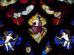 Im Maßwerk befindet sich in zentraler Stelle eine Majestas-Domini-Darstellung umgeben von musizierenden Engeln.