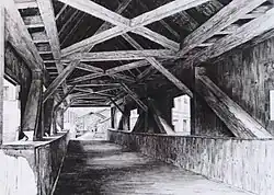 Die Brücke war als kombiniertes Spreng- und Hängewerk ausgebildet und wies eine Spannweite von 17,5 Metern auf. Die Fahrbahn bestand aus fünf Balken, die an den Ufern auflagen, durch das Hängewerk dreimal unterfangen und mit querverlegten Bohlen belegt waren. Beidseits waren drei kreuzförmige Fenster ausgespart. Das einfache Walmdach, mit Sparren, ohne First- und Fusspfetten war mit Ziegeln bedeckt. Die Dachkonstruktion war durch horizontale Streben ausgesteift und durch Andreaskreuze querverstrebt.[3]