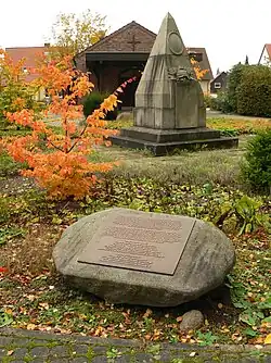 Gedenkstein auf dem Alten Friedhof in Altwarmbüchen, dahinter das Ehrendenkmal für die Gefallenen der Weltkriege