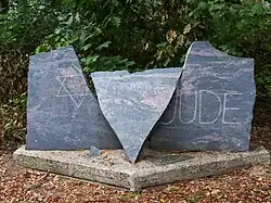 Das Denkmal besteht hauptsächlich aus einer in drei Teile gebrochenen Natursteinplatte, die in unterschiedlicher Schrägstellung auf einem Betonsockel angeordnet sind. Durch Vertiefung sind links ein Davidstern, in der Mitte eine (abstrahierte) Marschkolonne und rechts das Wort „JUDE“ in die Plattenteile eingelassen. Dabei sind sowohl der Davidstern wie auch das Wort „JUDE“ in den Bruch hineingenommen. Drei weitere kleine Bruchteile der Granitplatte sind in das Betonfundament eingelassen, auf einer von ihnen stehen die Daten „9.11.1938“ und „9.11.1988“.[1]