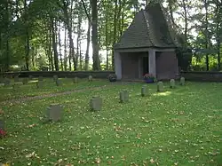 Der Volksbund Deutsche Kriegsgräberfürsorge ersuchte die Stadt Bremerhaven am 19. Mai 1952 um die Erlaubnis zum Bau einer Ehrenhalle auf dem Ehrenteil des Friedhofs für gefallene Soldaten und Bombenopfer. Ende Juni 1955 wurde die Ehrenstätte eingeweiht.[8] Sie umfasst 360 Tote, davon 252 Wehrmachtsangehörige, 99 bei den Luftangriffen auf Wesermünde umgekommene Zivilisten und 9 Ausländer. In der Ehrenhalle sind die Namen der Toten an der Wand hinter dem Christus-Korpus angebracht. Die Inschrift auf dem Stein am Eingang des Ehrenhaines lautet:
