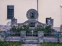 Links und rechts dieser Widmung sind Tafeln mit den Namen der Gefallenen des Zweiten Weltkrieges angebracht.