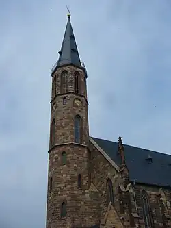 - Die evangelische Kirche St. Johann Baptist ist eine neugotische Saalkirche mit eingezogenem Chorpolygon und schlankem, achteckigem Westturm. Sie wurde vermutlich 1866–68 nach einem Entwurf von Friedrich August Stüler anstelle eines mittelalterlichen Vorgängerbaus errichtet. Die Verblendung besteht aus Sandsteinquadern, die Ausstattung stammt aus der Erbauungszeit. Zu beachten ist ein aufwendig skulptierter Taufstein aus dem frühen 17. Jahrhundert, dessen sechsseitiger Fuß Luther, Paulus und die Evangelisten zeigt.[2]
